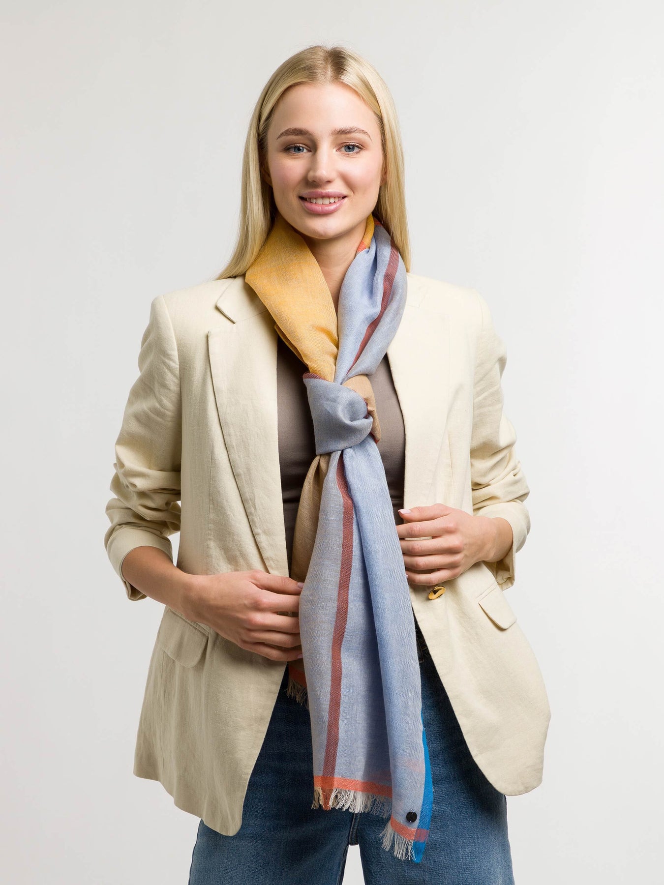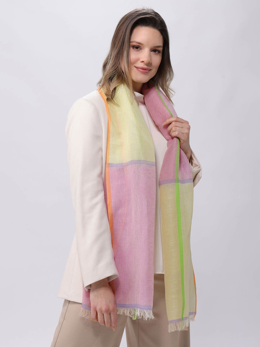 Sommer Pur: Sommerliche Farben, klassisches Muster leichtes Material und unendliche Kombinationsmöglichkeiten. Unser FRAAS Schal aus Baumwolle und Leinen in den Maßen 50 x 180 cm ist Ihr Begleiter für ein sommerliches Fest aber auch Ihr Held im Alltag.