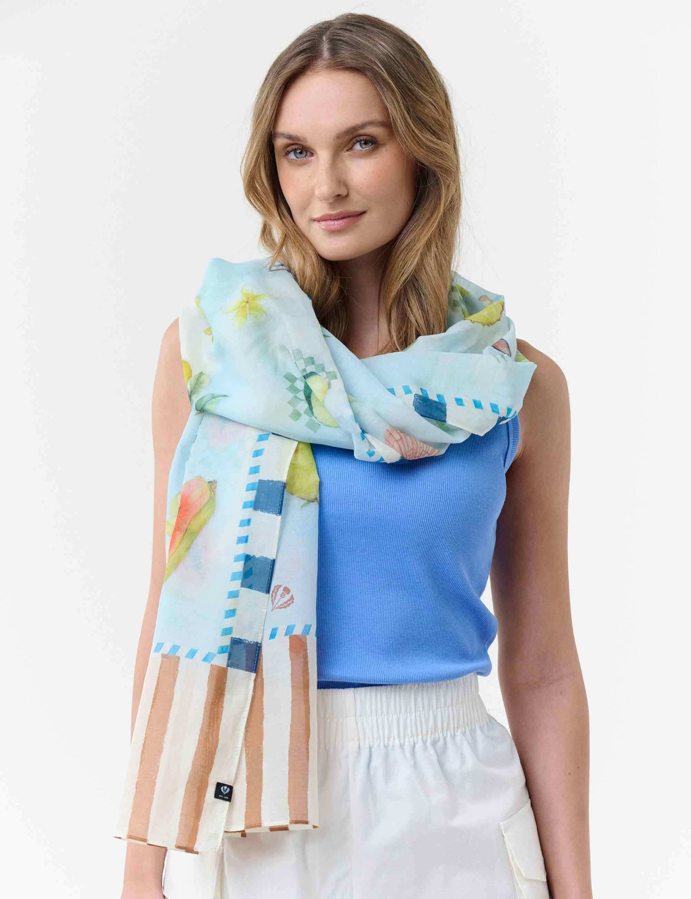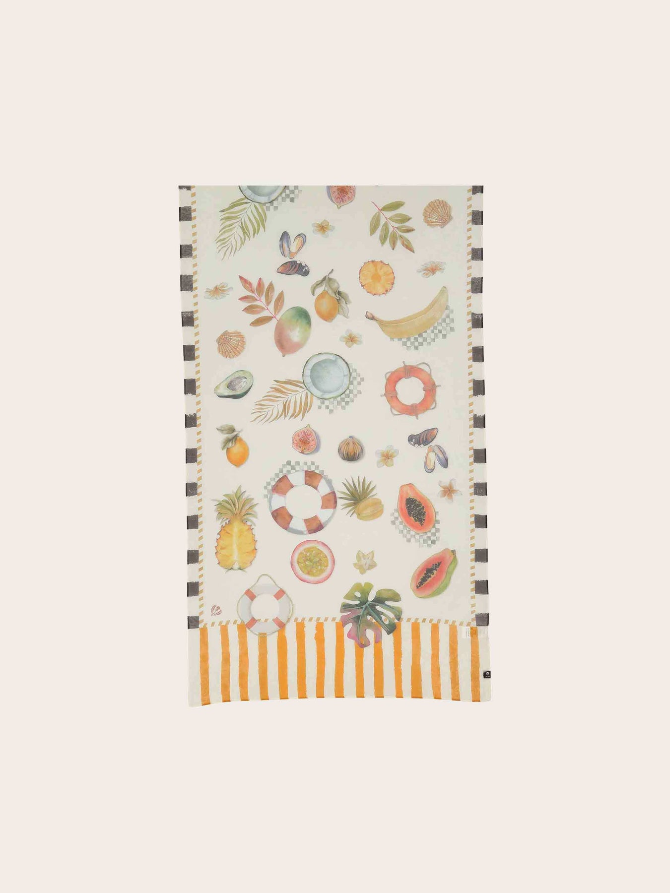 FRAAS Schal für Damen (65 x 180 cm) mit fröhlichen Urlaubs-Motiven: Schwimmringe, Muscheln, Blätter und exotische Früchte, eingerahmt von maritimen Farbstreifen. Leichte, angenehme Seidenmischung aus 70% Baumwolle und 30% Seide, ideal für Sommer und Reisen.