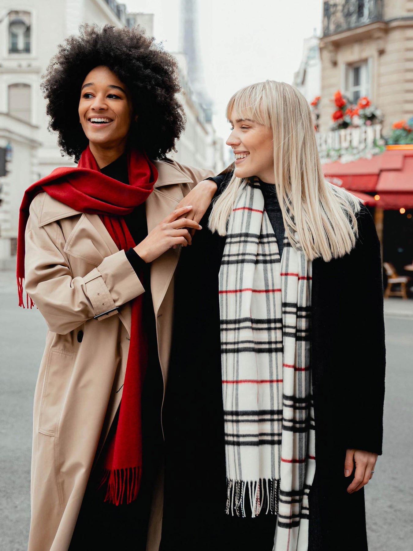 Zwei Frauen laufen am Meer über den Strand und halten zwei XL FRAAS-Stolen über sich in den Wind.