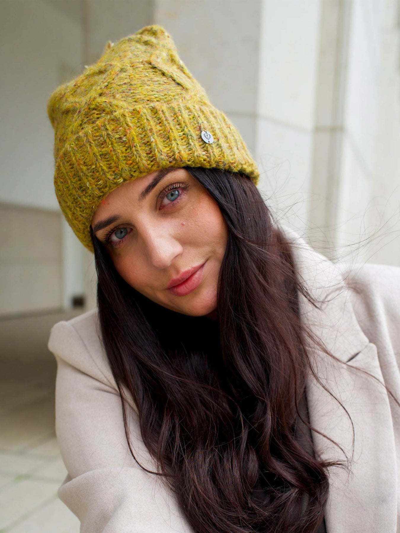Nahaufnahme Frau mit Sonnenbrille, Strickschal und passender Mütze